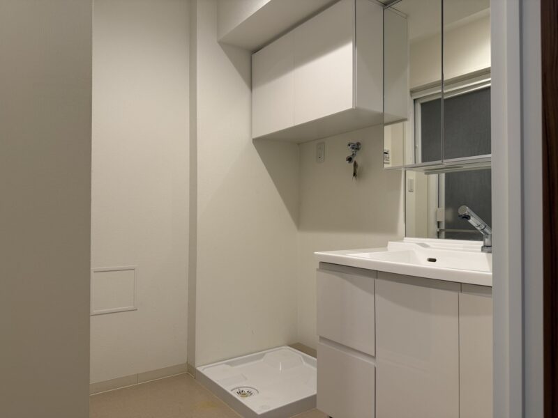 小物は3面鏡収納へ 洗濯パンの上にも便利な収納あり